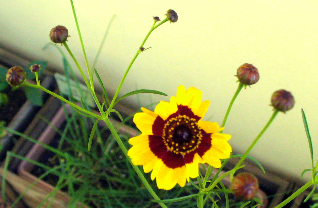 Lembram que em Abril eu falei sobre novas flores comestíveis? Naquela época, eu tinha acabado de semear essa daqui, que é a calliopsis (Coreopsis tinctoria). A foto não mostra que esse centro é uma cúpula delicadíssima de estames, como se formassem mesmo um daqueles ocelos de inseto, com mil olhinhos. Não tive coragem de comer ainda, então não sei como é o gosto, mas quis dividir a beleza com vocês.